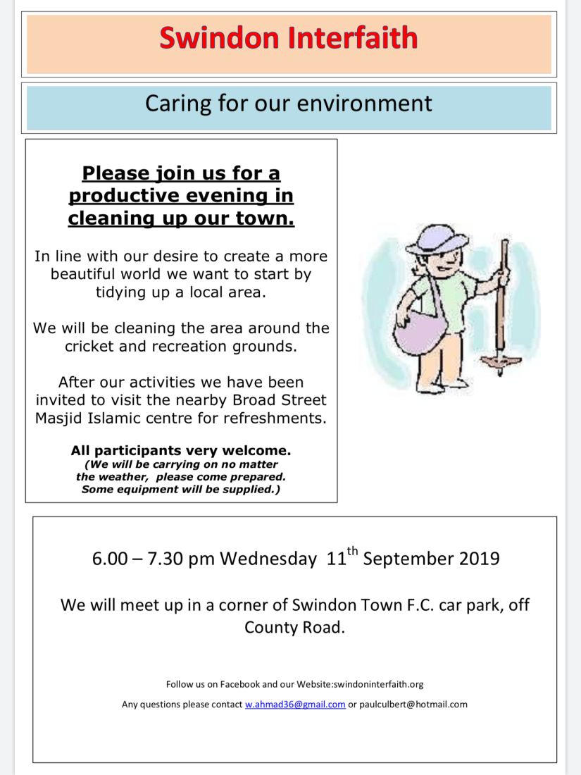 Please meet us in the stadium car-park at 6.00pm, from where we will start our clean up, the aim is to finish around 7.30pm and then have some refreshments in the Broad Street Islamic centre.